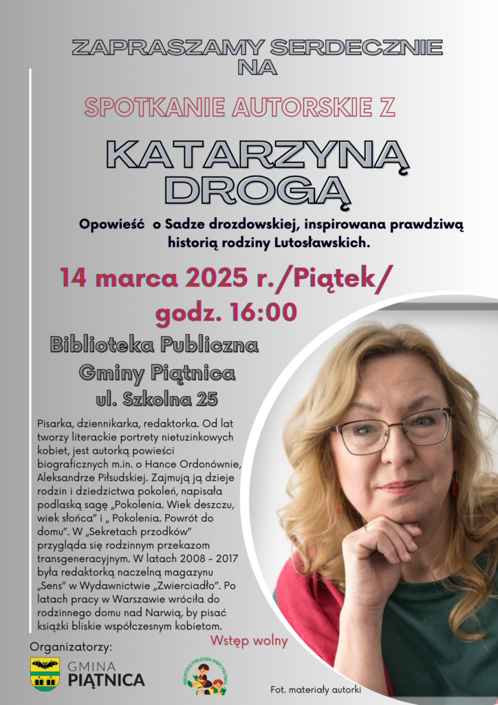 Serdecznie zapraszamy na spotkanie autorskie z Katarzyną Drogą, która opowie o Sadze drozdowskiej – opowieść inspirowana prawdziwą historią rodziny Lutosławskich.